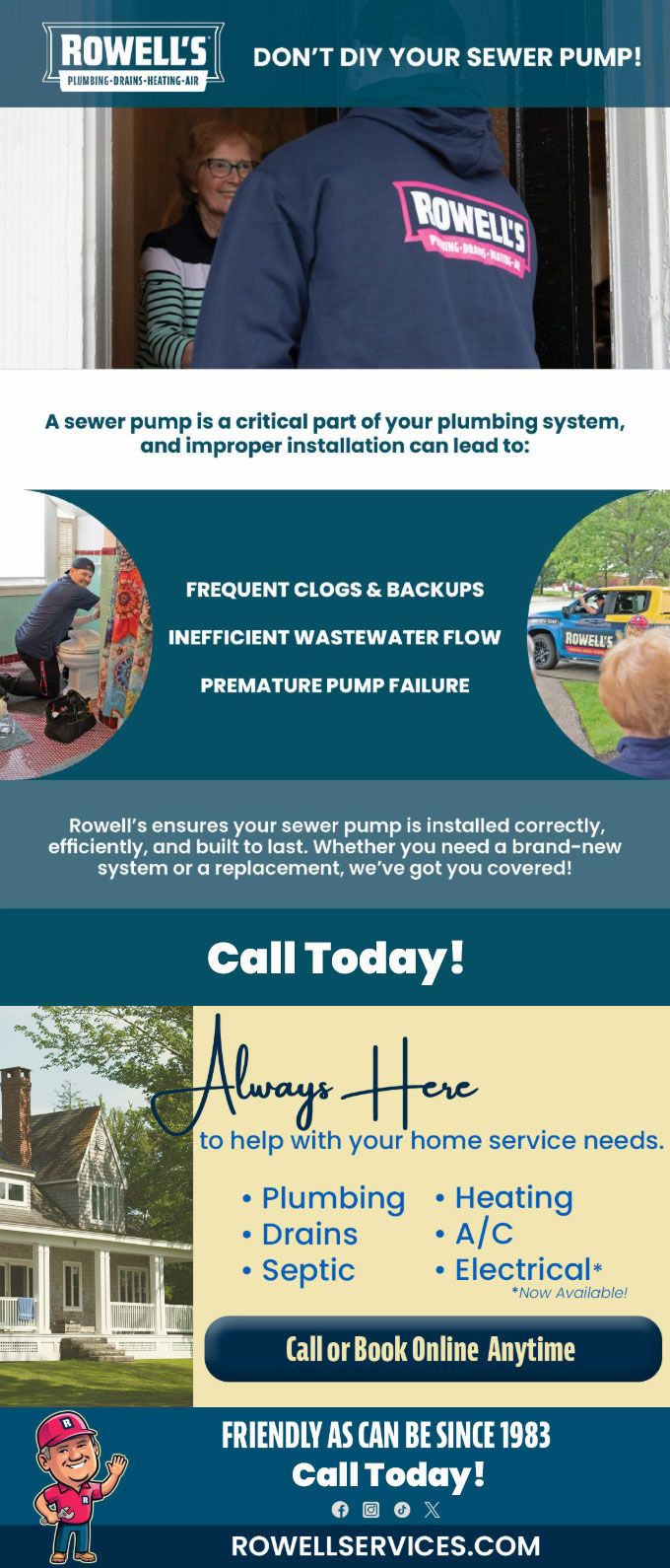 "Friendly As Can Be Since 1983!" When you need help with your plumbing, drains, heating, cooling or electrical in Northfield, you can always rely on Rowell's Services! Call us now or book online!